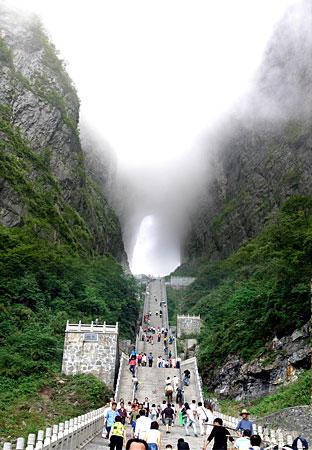 選擇乘索道游覽天門山是最佳視角。索道吊廂一出站房,馬上就騰空飛了起來,從城市的一棟棟樓頂掠過,猶如在城市上空滑翔。翻過一道山梁之后,城市被遠(yuǎn)遠(yuǎn)拋在了視線以外,大片翠綠的稻田映入眼簾,透過打開的通風(fēng)窗口,一陣陣青草水田特有的清香沁入心脾;蚋呋虻偷霓r(nóng)舍不時(shí)從我們身下滑過,牛羊們?nèi)齼蓛捎崎e的在田間浮動(dòng)著,靜謐、安詳。再翻過一座山峰,我們便立即被滿山的青翠所包圍,萬仞絕壁也已投懷送抱。索道支架矗立于絕壁天險(xiǎn)中,或挺立或傾倒或探頭或擁抱,我們繼續(xù)在艱險(xiǎn)中游歷,時(shí)而隱沒于云堆,時(shí)而出世于蒼穹。這時(shí)你除了那滿懷的驚險(xiǎn)刺激外有的便只有望索而興嘆了。我拍了很多片子,但是總覺得還是沒有足以記錄下來這座空中盆景的壯麗。