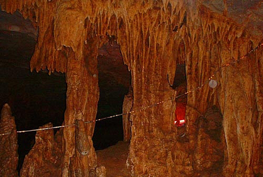 | 藏君洞為一大型天然溶洞,溶洞長25000米,已探明洞長4000m,洞內(nèi)洞中有洞、洞中有河,迂回曲折,地下河流水潺潺,溶洞分布在石炭系中、上統(tǒng)碳酸鹽巖中,洞內(nèi)鐘乳石十分豐富:石筍、石柱、石幔、石樓、石像比比皆是。洞內(nèi)構(gòu)造奇特,石鐘乳千姿百態(tài)、絢麗多彩,景觀奇秀,珍品奇絕,是我國少有的大型碳酸鹽巖巖溶洞穴之一。目前已開發(fā)的4000m洞穴中,由十二個(gè)大的溶洞群構(gòu)成,由洞口往里有護(hù)君堂、惠帝殿、兩重天、南巡廳、不夜城、龍鳳宮、北國廳、江南廳、江河壩、閱兵場、國寶廳等溶洞景觀區(qū)。溶洞一般高5~30m,長60~100m,寬10~20m,面積60~200㎡。十二個(gè)溶洞沿地下河呈串球狀分布,洞與洞之間有巷道(地下河管道)相連,溶洞中景觀十分豐富,仿佛是一個(gè)瑰麗的地下宮殿。如護(hù)君堂內(nèi)有“尚書帽”、“御馬”、“貓頭鷹”、“小羊羔”、“老夫妻”、“天宮浴盆”等景點(diǎn),惠帝殿內(nèi)由“斷劍石”、“龍椅”、“觀音立佛”、“觀音蓮花寶座”等,“蔬果長廊”中有形似花菜、白菜、絲瓜、茄子、黃瓜等石筍,不夜城內(nèi)有乳白色石鐘乳巖溶坡面,龍鳳宮內(nèi)有石幔、石柱琳瑯滿目及鐘乳石構(gòu)成的似漢白玉“龍鳳石床”、“旭日東升”的浮雕石鐘乳墻、“燈籠群”、“攀龍柱”、“石蓮花”等,國寶廳巨型石柱等,巷道側(cè)壁唐僧師徒“西天取經(jīng)”壁畫等,景觀類型齊全,是巖溶洞穴中具有典型地學(xué)意義的巖溶地貌景觀,屬國家級的地質(zhì)遺跡景觀。