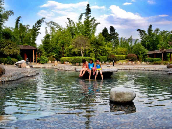 山莊共擁有泡池 33 個,其中溫泉池 24 個,冷水池 9 個,并設(shè)有 800 平方米的室內(nèi)溫泉游泳池一個,按摩理療室 13 間。美容護理項目所用產(chǎn)品為臺灣佐登妮絲國際美容 SPA 館 Q10 系列特色美容產(chǎn)品,采用歐式樣經(jīng)絡(luò)按摩手法,配合呼吸、音樂韻律可有效達到身心放松的目的。福泉山莊熱泉水“氡”的含量達到 130INA ,正常情況下,氡元素含量達到 30INA 即可作為生殖系列輔助治療藥物。