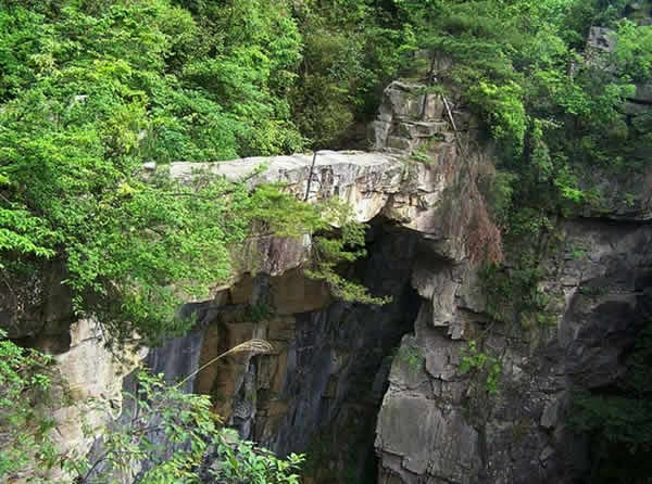 仙人橋又稱天下第一橋,坐落在猴子坡上、天子峰下的王爺洞對面。橋?qū)僮匀恍纬,長26米,寬1.5米,厚一米多,高約六七十 米,飛架在兩岸懸崖絕壁之上,鬼斧神工,惟妙惟肖,古人云:“天地可掬,此真天造也”。仙人橋為紅砂巖結(jié)構(gòu),兩端生有高大的黃山松和杜鵑樹,濃蔭掩映,極其美麗。橋的東頭還有自然形成的石級,人可順石級而下,走上天橋,下視萬丈深淵,令人頭暈?zāi)垦#墙颜卟桓矣庠,旅游者無不贊嘆,說它是“天下絕景”。
