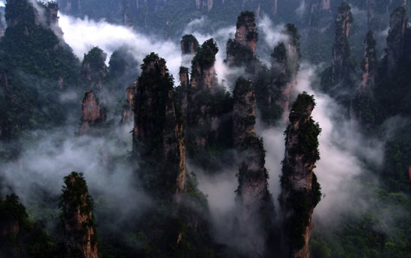 從仙人橋去老屋場,但見深谷里密密麻麻羅列上百座石峰,活像一群威武雄壯的將士列隊聽令,相傳這是向王天子的神兵在聚會。神話雖不可靠,但石峰如此集中壯觀,在武陵源也屬罕見。我想引用一位美術(shù)大師的話:“豈有此理,莫名其妙,說也不信,到此方知”。不看神兵聚會,怎知石峰成林。