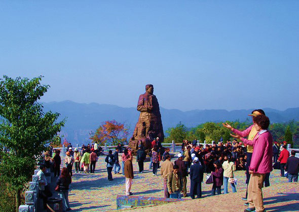 在茶盤塔的西南側(cè),有一座海拔1200多米高 的山峰,這就是“天子峰”。天子峰,看上去活象一位偉人,他坐在那里,身披鐵甲,右手握箭,濃眉隆起,兩眼怒視前方,似正要指揮千軍萬馬出征,大戰(zhàn)一場。這個形象就是人們傳說的向王天子,所以取名叫“天子峰”。 |