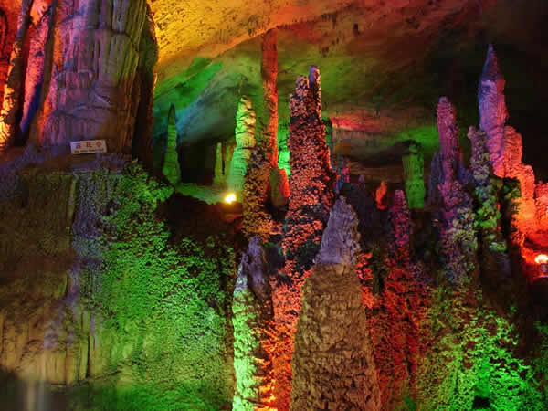 | 九天洞位于湖南張家界市桑植縣城17公里的利福塔鄉(xiāng),距市區(qū)70公里,距武陵源62公里,因洞內(nèi)有九個(gè)自然天窗九天洞而得名,總面積250公頃,是中國目前發(fā)現(xiàn)的溶洞之最,比號(hào)稱世界第一的利川溶洞大三倍。九天洞內(nèi)空氣清新,冬暖夏凉。整座洞穴分上、中、下三層,有五層不同高度的螺旋式觀景臺(tái),最下層低于地表面400多米。經(jīng)初步探明洞內(nèi)有40個(gè)大廳、3條落差懸殊的陰河、12條瀑布、5座自生橋、10余座洞中山,此外,還有不可勝數(shù)的五光十色的鐘乳石群。在眾多迷人的景觀中尤以九星山、玉宮、水晶宮、九天玄女宮、壽星宮五大奇觀最為著名。
