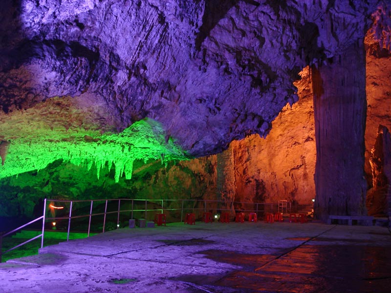 桑植縣九天洞 九天洞總面積達(dá)250多萬平方米,分上、中、下三層,最底層于地表420米。洞內(nèi)有40個(gè)大廳、3條陰河、12條瀑布、5座自生橋、6處千丘田、3個(gè)自然湖。洞中石筍、石柱林立,石簾、石幔遍布。堆珍疊玉、千姿百態(tài)。九天洞被譽(yù)為中國溶洞奇葩。