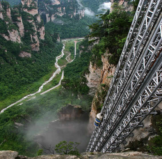 | 百龍?zhí)焯菀挥谑澜缱匀贿z產(chǎn)張家界武陵源風(fēng)景名勝區(qū),1999年9月動工,2002年4月投入營運(yùn),電梯的主要設(shè)備由德國知名電梯公司研究生產(chǎn),耗資人民幣1.8億元,被譽(yù)為“世界上最高、運(yùn)行速度最快、載重量最大的電梯”,也因此被載入吉尼斯世界紀(jì)錄。
