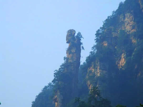三姐妹峰 轉(zhuǎn)閣樓 是一座拔地而起的石峰,峰頂空心有“窗”,整個(gè)石峰遠(yuǎn)看像一座多級(jí)寶塔,近看又似一座轉(zhuǎn)盤閣樓。由一條羊腸小道盤旋而上,可直達(dá)樓頂。轉(zhuǎn)樓低層巖石成一環(huán)形回廊,人立石廊之中,秀巒依偎。石樓一側(cè)另有石室相附,闊容百人,與閣樓一主一仆,相映成趣。入十里畫廊約30米,有一石峰恰如一老壽星迎面站立,五官輪廊分明,短頭發(fā)長(zhǎng)眉毛,眼睛深邃,笑容可掬。他左手高高揚(yáng)起,似在招呼遠(yuǎn)方游客。壽星形神兼?zhèn),堪稱奇觀。壽星迎賓:在十里畫廊觀光,第一個(gè)景點(diǎn)便是“壽星迎賓”。那一座酷似老壽星的石峰,形同一個(gè)耄耋老人正招手示意,喜笑盈盈,恭候來客光臨呢!
