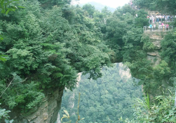 張家界天下第一橋 “天下第一橋”。橋長20米,寬僅1.5至3米不等,但較平坦,可通行人。橋上蒼松挺拔,橋下云霧蕩漾,萬丈深淵。四周懸崖絕壁,水滴飛濺。踏上橋面,使人有凌空御風之感。手扶鐵欄桿,仰視,青峰飄渺于云靄繚繞之中;俯瞰,奇峰如筍群,巖壑深谷中陣陣煙嵐泛起,散而復聚。這里是張家界風景一絕,是大自然的一個奇跡。您看,兩座山峰被一條長廊連在一起,形成天然橋洞,平時吞云吐霧,氣勢壯觀雄奇.橋面寬約兩米,長20余米,絕對高度350米。橋上蒼松挺拔,橋邊古藤垂掛,橋下深不可測。遠觀此橋,云霧繚繞,橋身若隱若現,好似水中倒影一般。走在橋上,只見霧氣蒸騰,松濤呼嘯,石橋好像也顫顫悠悠,晃晃搖搖似的,令人驚心動魂。這里是張家界風景一絕,是大自然的一個奇跡。