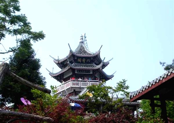 | 六奇閣位于張家界森林公園黃石寨項的人工建筑。因張家界國家森林公園”山奇、水奇、云奇、石奇.樹奇以及珍禽異獸之奇”而得名。閣分3層,黃瓦蓋頂,飛檐翹角,畫梁彩棟,回廊石欄。登閣憑眺,滿目佳景。閣柱楹聯(lián)日:“翠鬟煙籠,綠樹云封.昔日曾遮半個面:麗質(zhì)天生,畫圖省識,今朝始醉四方人。”又一聯(lián)云“名動全球,到此實堪三擊掌:勢拔五岳,歸來不用再看山。”閣內(nèi)設有土家風情歌舞樓.竟日絲竹弦管,清音繞梁。閣基嵌有《張家界國家森林公園記》全文碑刻。1995年9月8日.全國政協(xié)主席李瑞環(huán)登閣賞景。