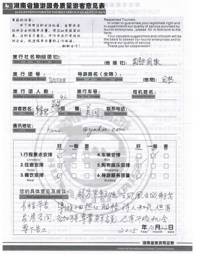 現(xiàn)在位置:首頁 -> 西部國旅->旅游質(zhì)量反饋 -> 2015-10-18 臺灣韓先生一行4位貴賓 天門山、張家界、天子山、鳳凰古城四日游