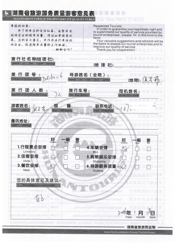 1月份,長沙張女士一行7位貴賓與湖南西部(張家界)中國國際旅行社工作人員——張群取得聯(lián)系,經(jīng)過商談,雙方達成協(xié)議并簽訂旅游合同,于1月16日抵達張家界,開始張家界之旅。此次行程是由我社優(yōu)秀導(dǎo)游——侯芳菲負(fù)責(zé)旅游接待工作,侯在旅游過程中講解詳細(xì),客人也很滿意。同時也感謝張女士一行貴賓選擇湖南西部(張家界)中國國際旅行社,以及您對湖南西部國旅的信任與支持。我們會繼續(xù)努力,做好旅游接待工作。期待下一次與您的合作,祝您愉快!